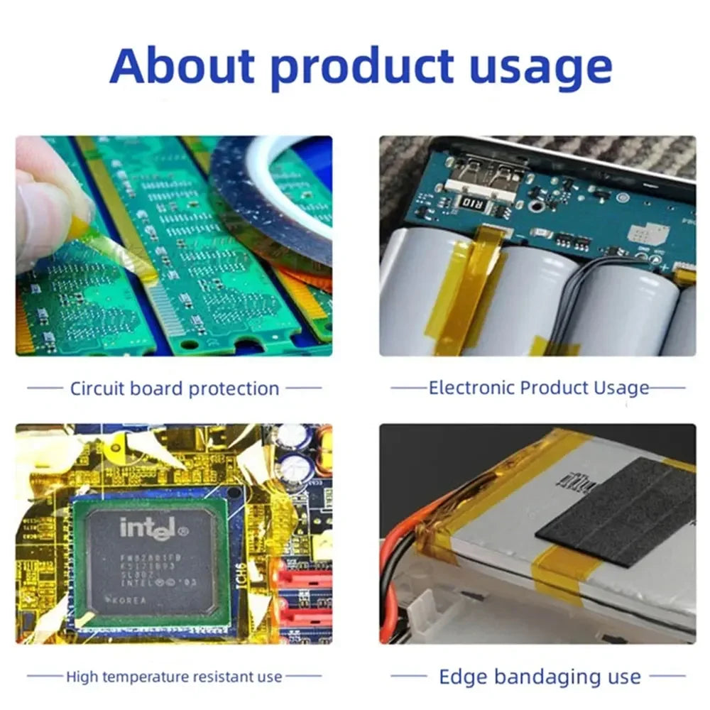 Widely used for phone battery packaging, coil insulation and high-temperature masking, gold finger protection in SMT PCB soldering.