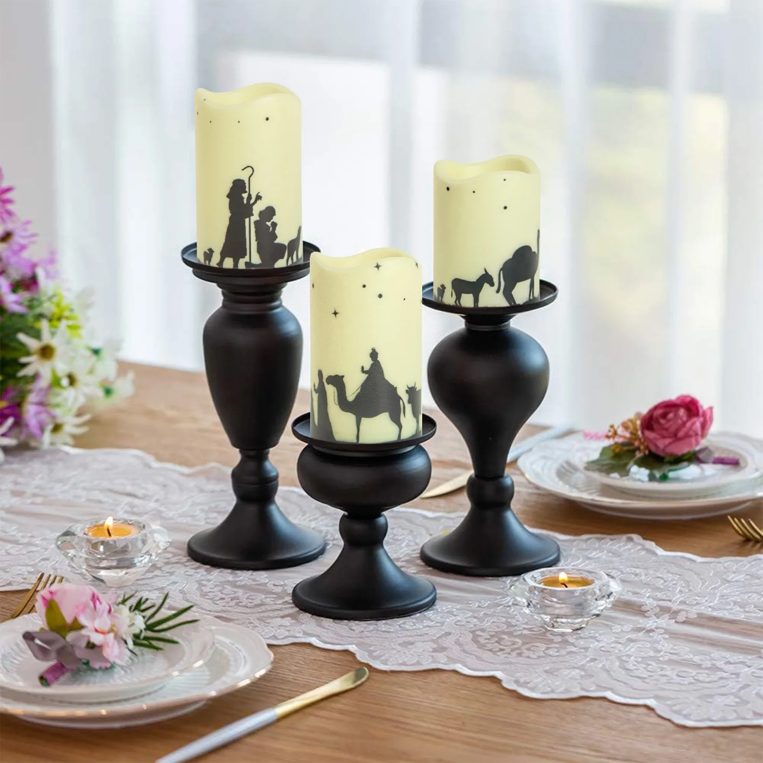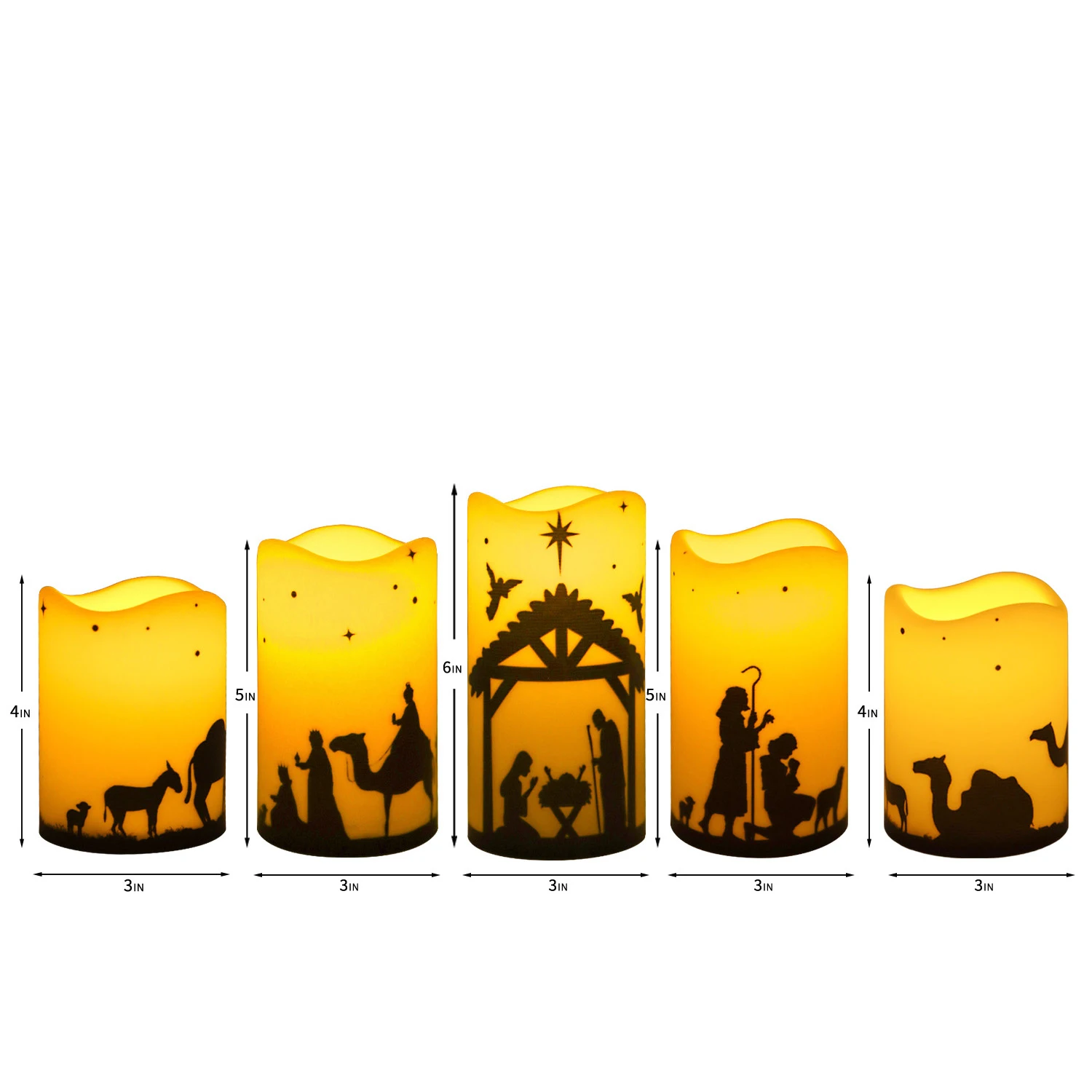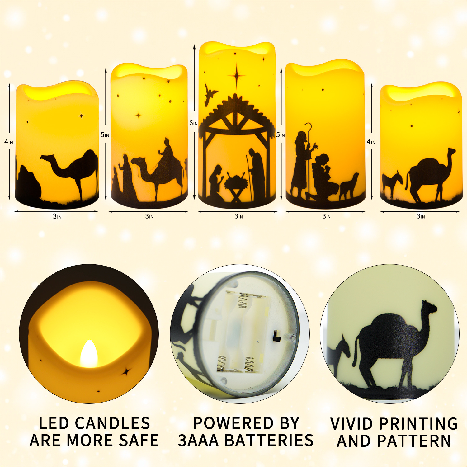 5pcs Flameless LED Christmas Nativity Scene Candle Lights Battery Powered Religious Pillar Decoration for Indoor Holiday Home