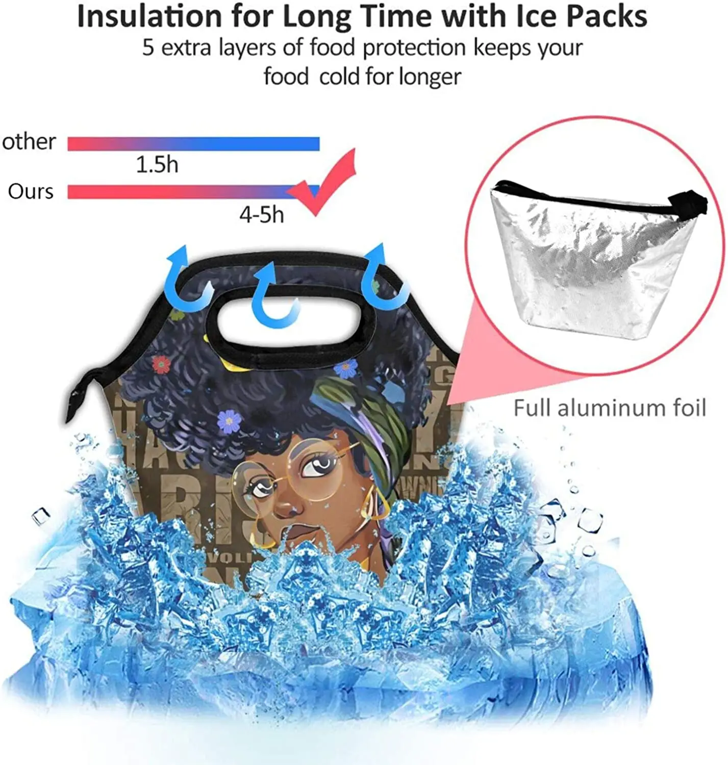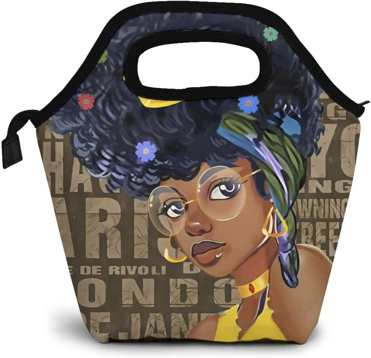 African American Women Lunch Bag Black Girl Handbag Lunch Kit Insulated Cooler Box for Travel Picnic Work School Reusable