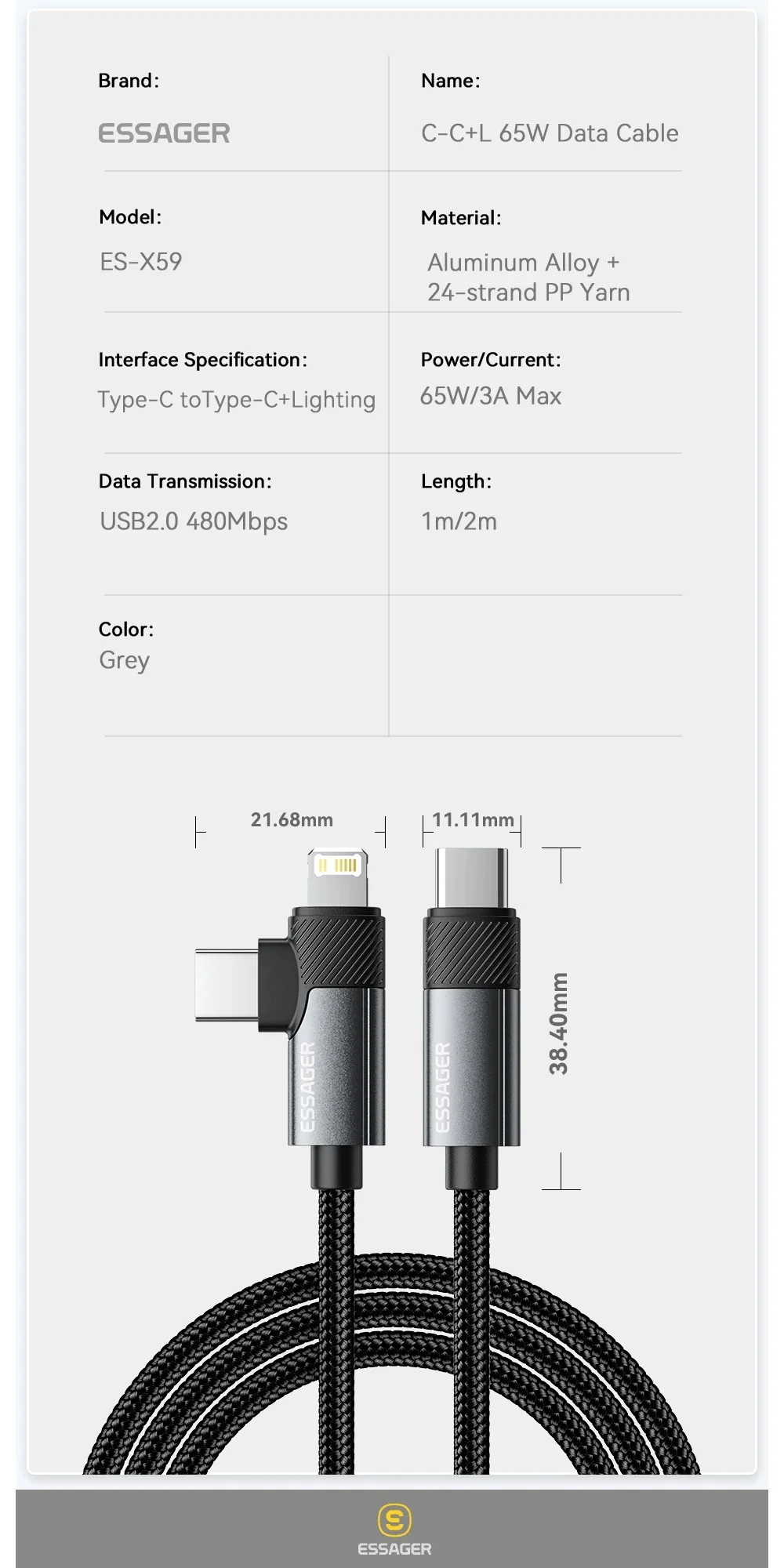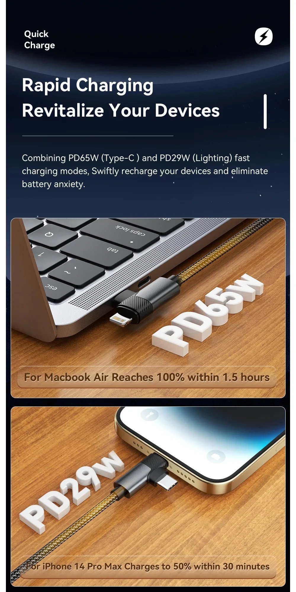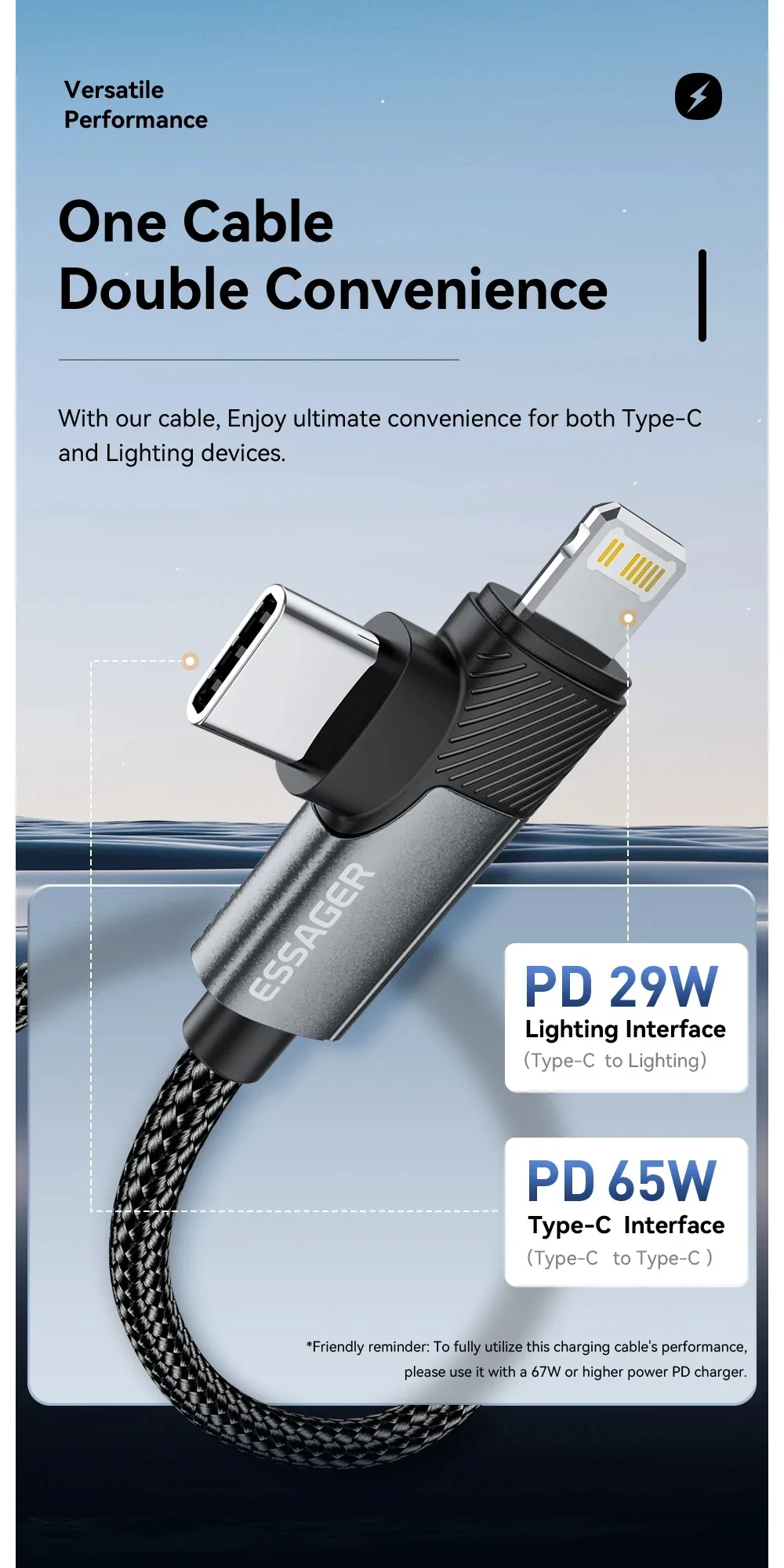 Essager 2-in-1 Right Angle Cable C-L 29W C-C 65W Fast Charging Elbow Data Cable For iPhone 16 15 14 MacBook Lenovo Dell iPad Pro