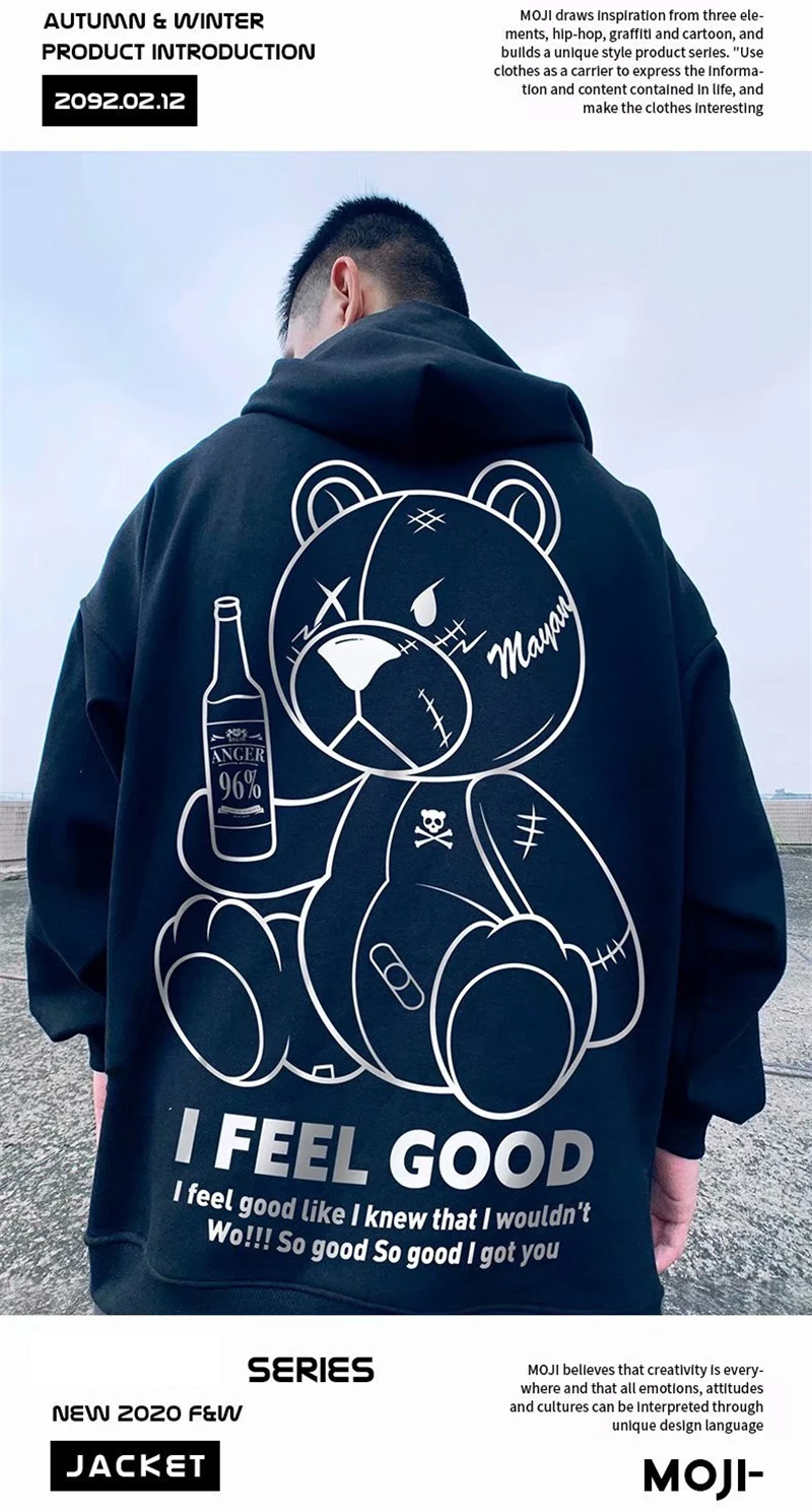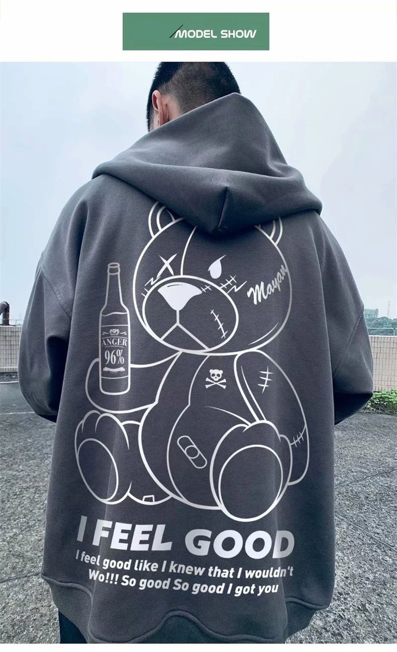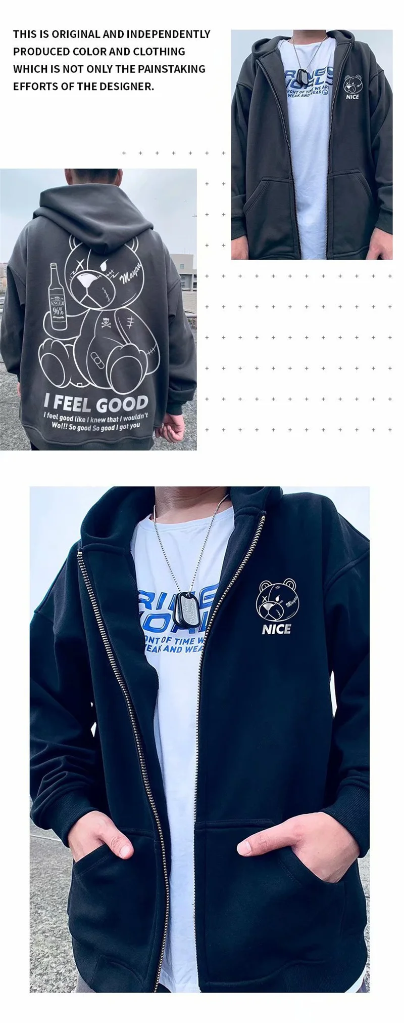 Men's Harajuku Fashion Hoodies Beer Bear Print Kawaii Sweatshirts Zipper Hip Hop Streetwear 2025 Autumn Casual Oversized Hoody