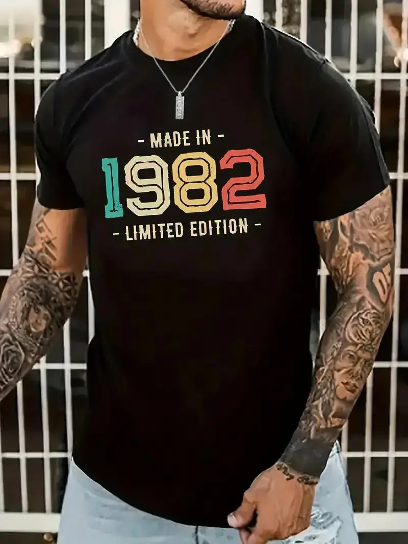 Number 1982 Print, Men's Graphic Design Crew Neck Active T-shirt, Casual Comfy Tees Tshirts For Summer, Men's Clothing Tops