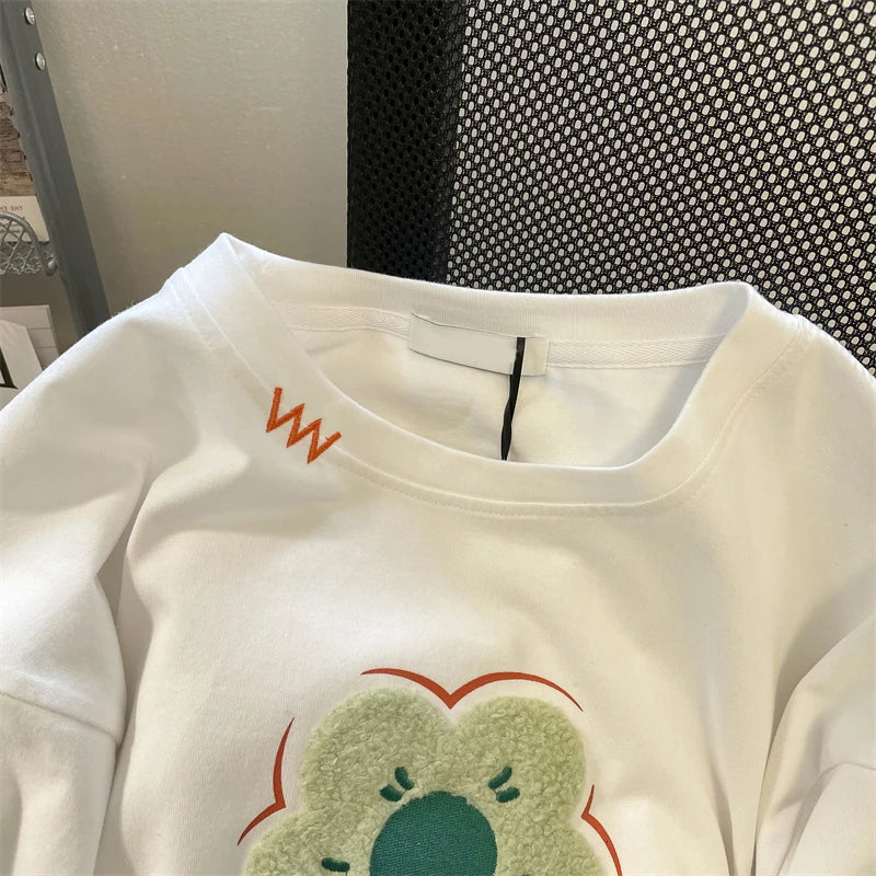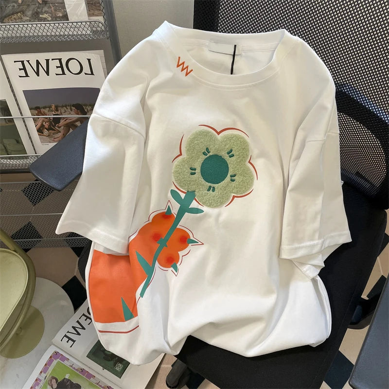 Retro High Street Short Sleeve Women Fashion Top 3D Flowers Flocking Graphic Tee Vintage Clothes Woman Designer Top 4XL 150KG