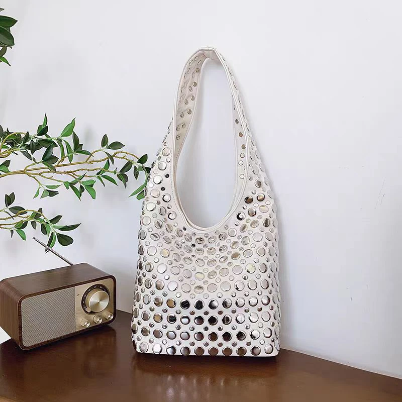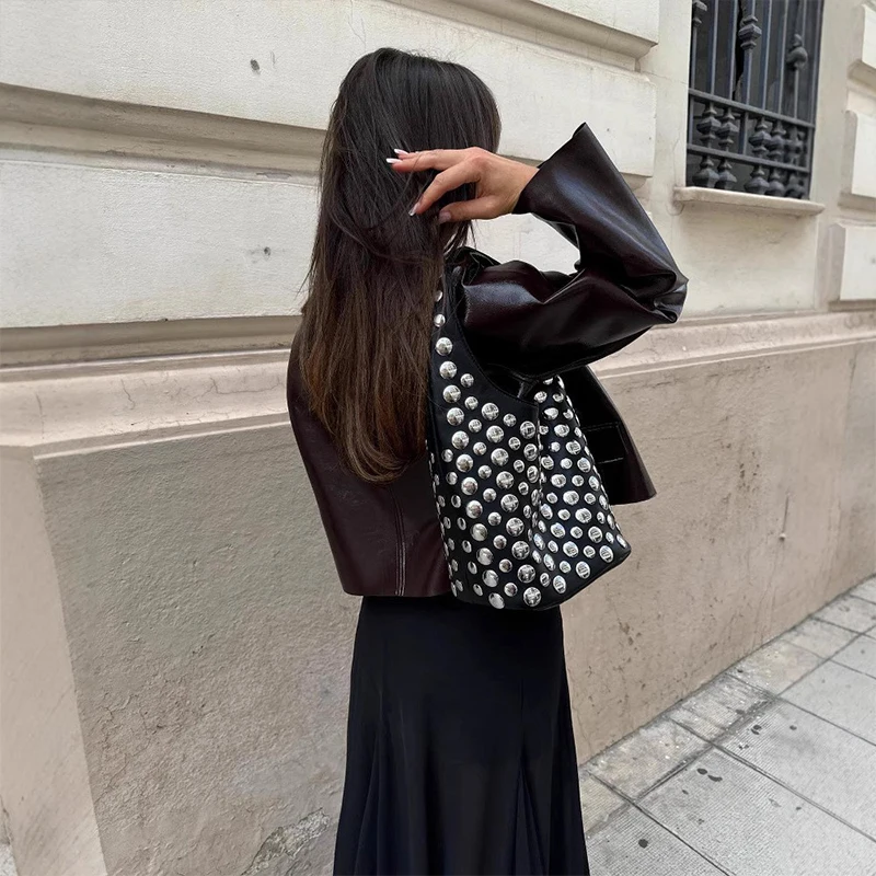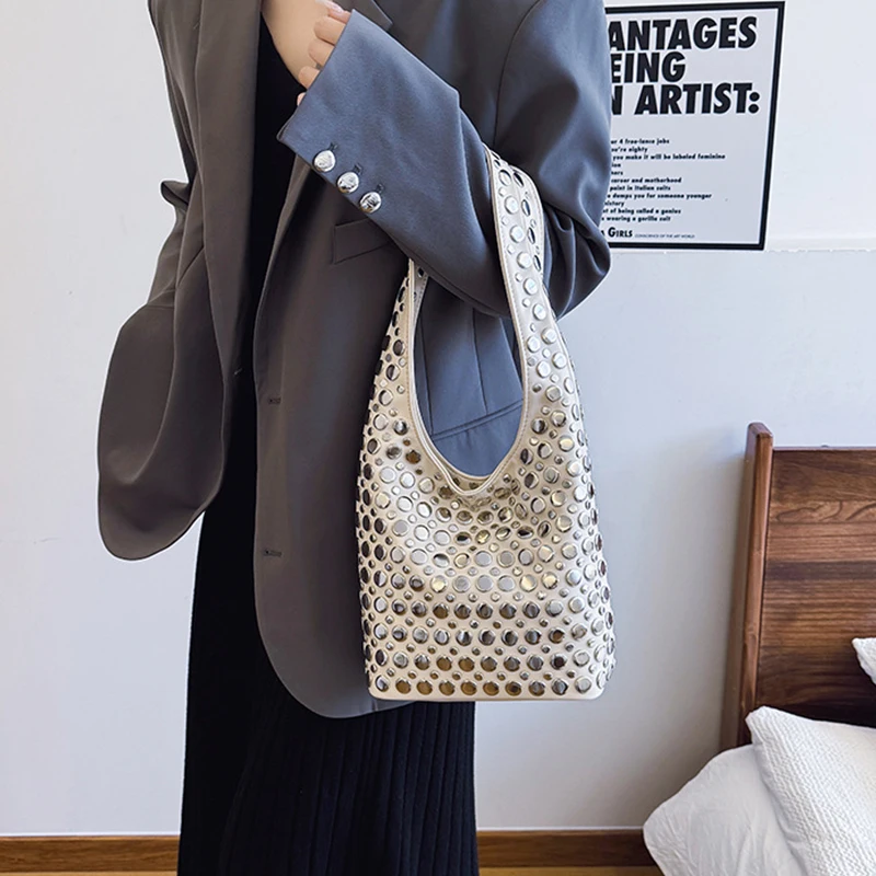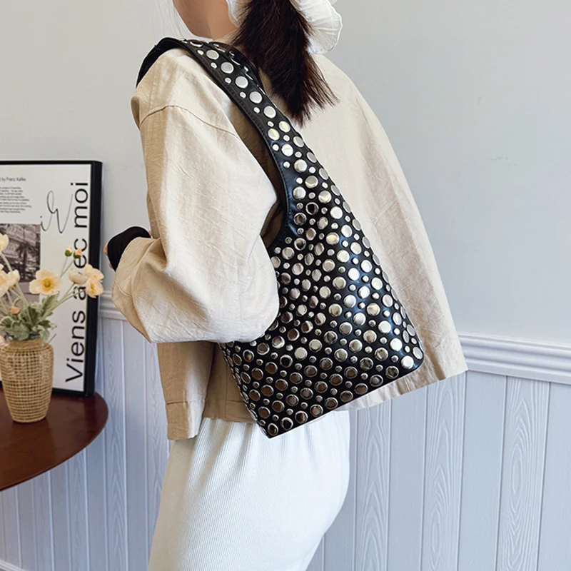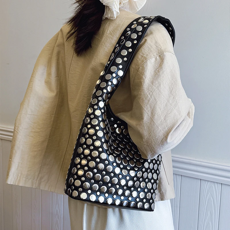 Trendy Underarm Bucket Bag Y2k Personality Girl Commuting Shoulder Bag High-end Versatile Handbag Polka Dot Rivet Underarm Bag