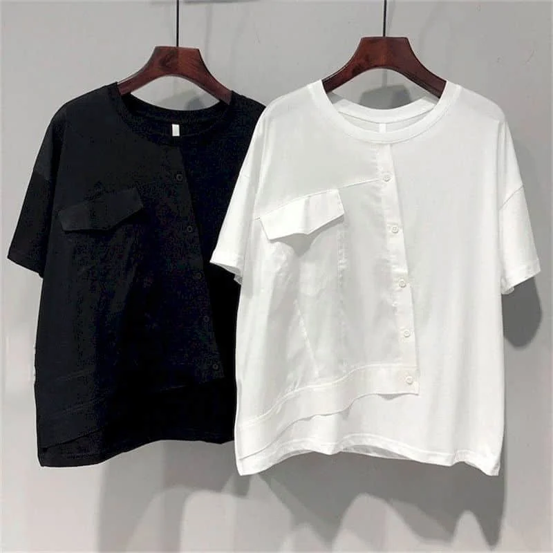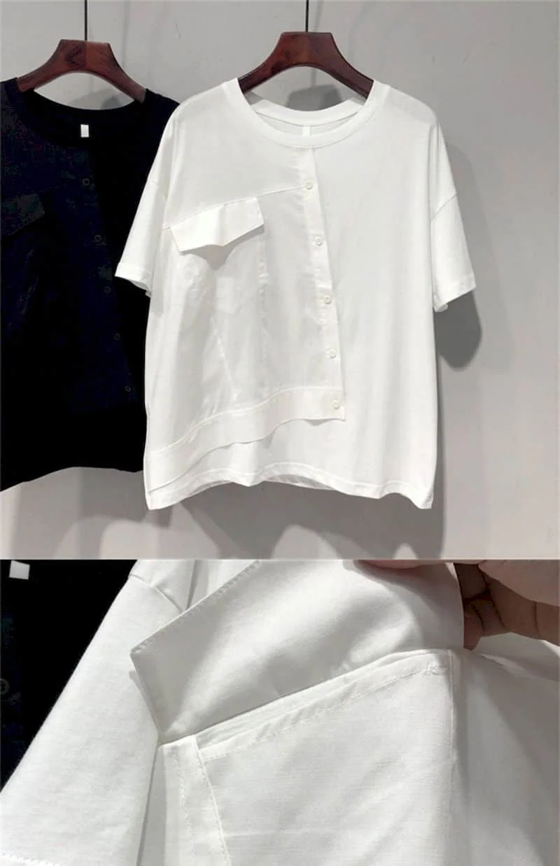 Unique Chic T Shirt Women Fashion Patchwork Design Short Sleeve T-shirt Casual Loose Niche Button Design Top Summer Trend Tshirt