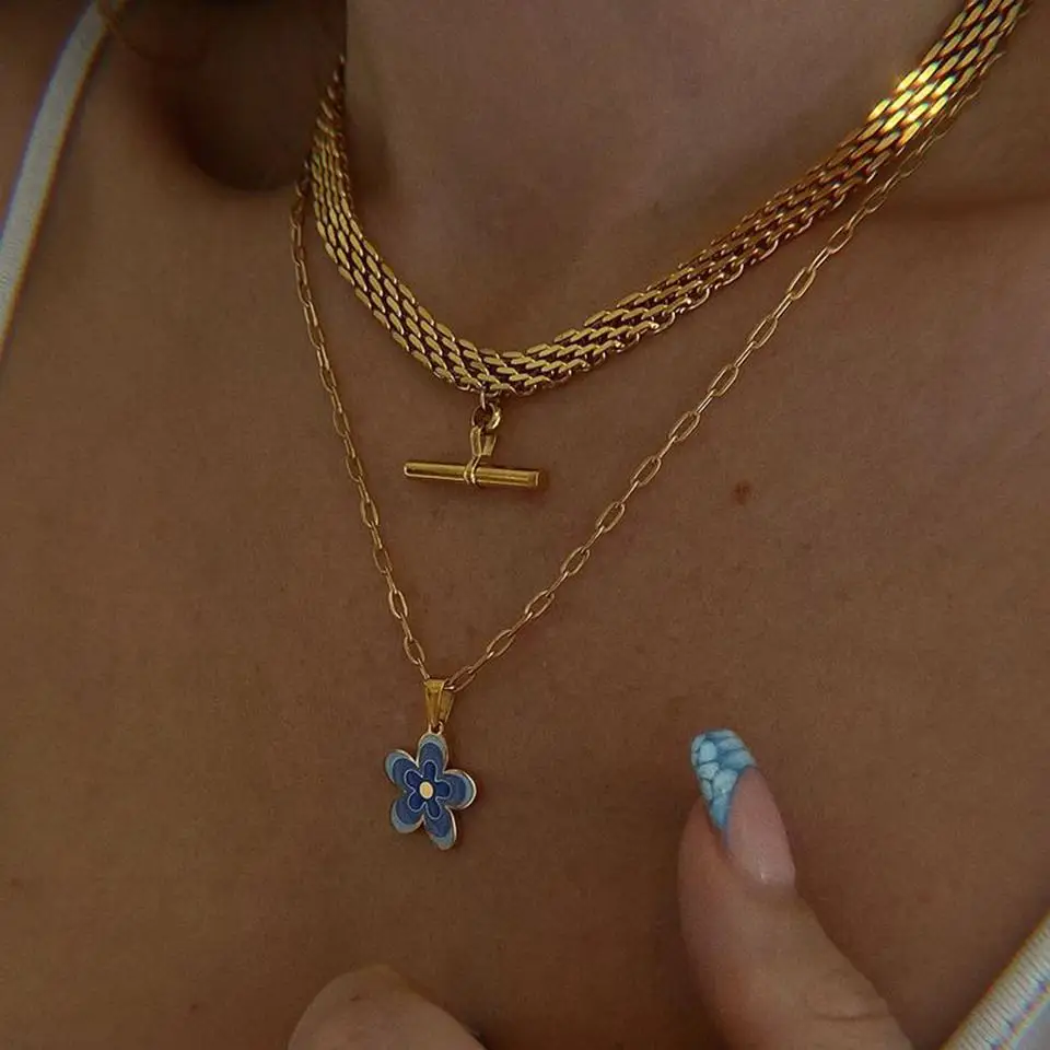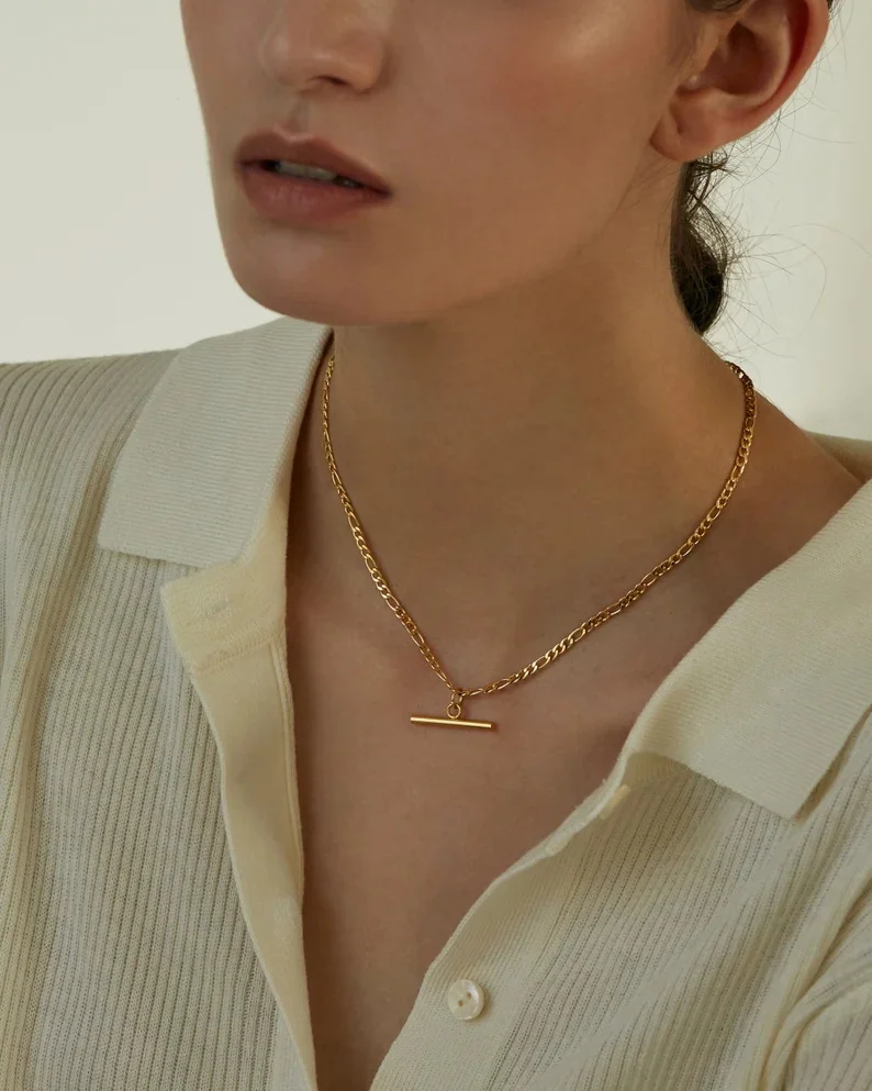 Uworld New 18K Gold Color Plating Figaro Cuban Chain T-bar Pendant Necklace Stainless Steel T-bar Pendant Necklace For Women