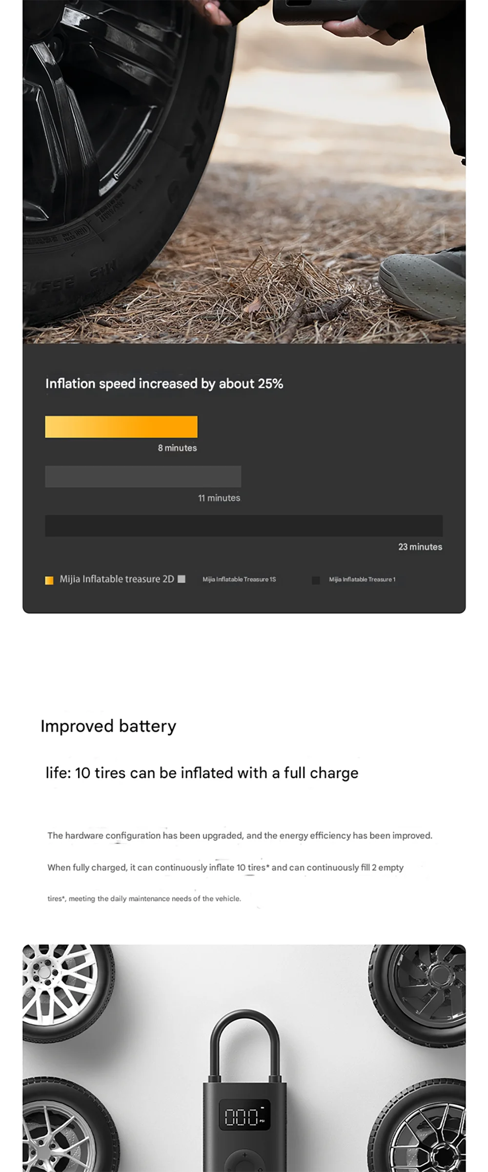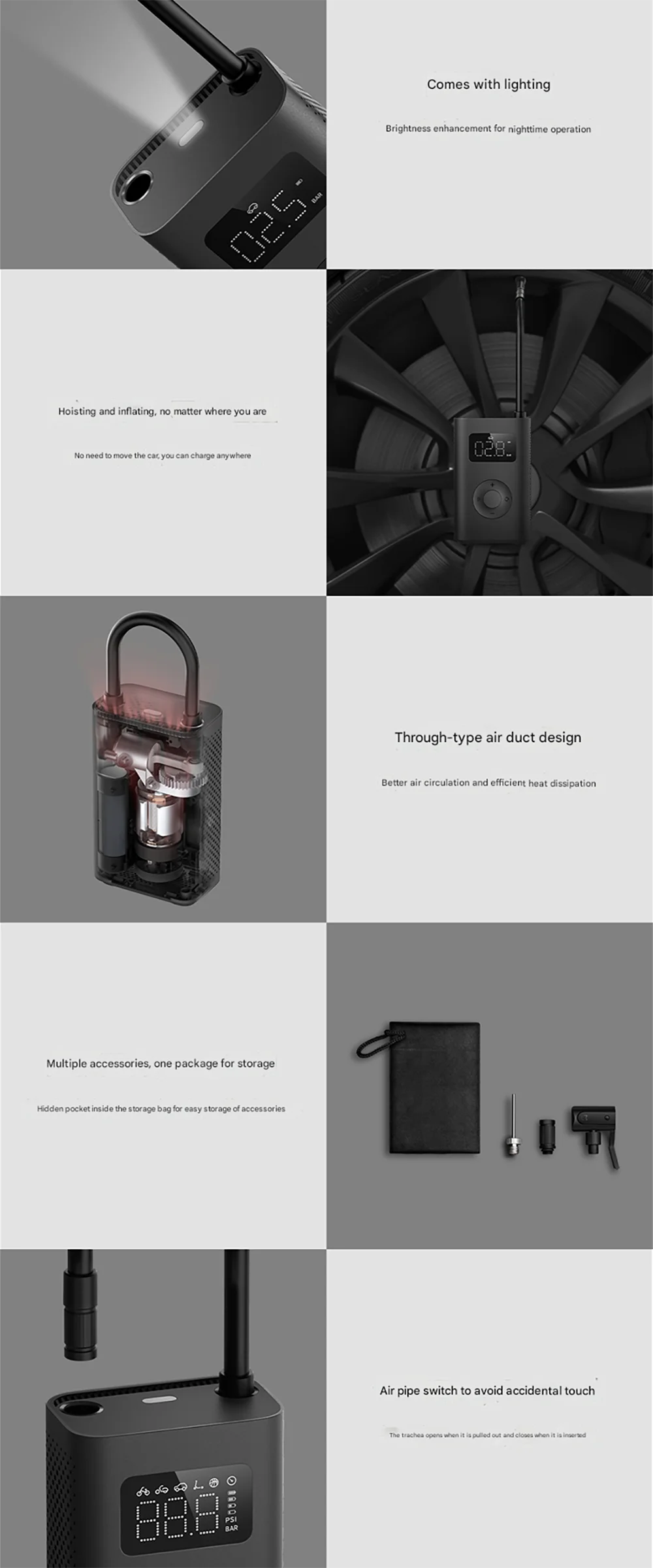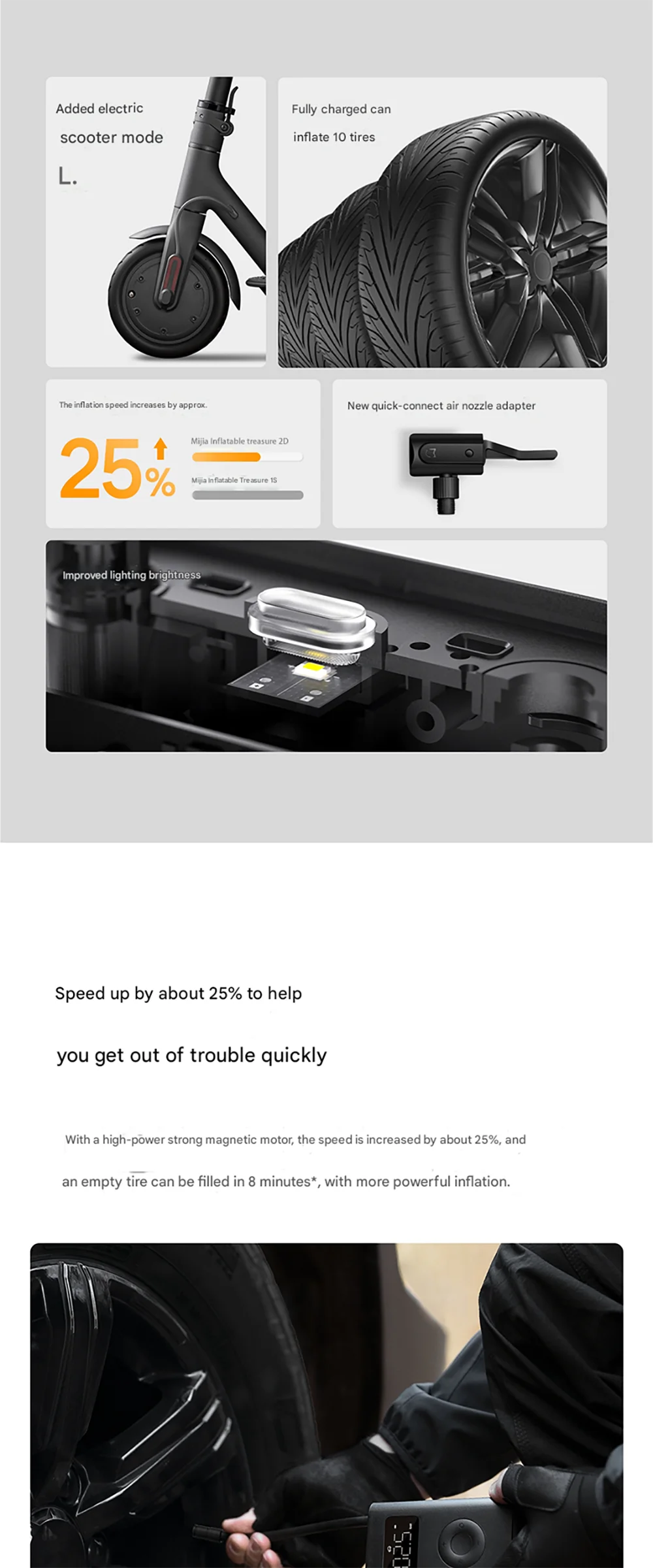 A new generation of air pump with better performance:Compared with the Mi Home Air Pump 1S, this pump has optimized details and improved internal structure. It inflates 25% faster to create a more convenient and efficient air-filling experience.
