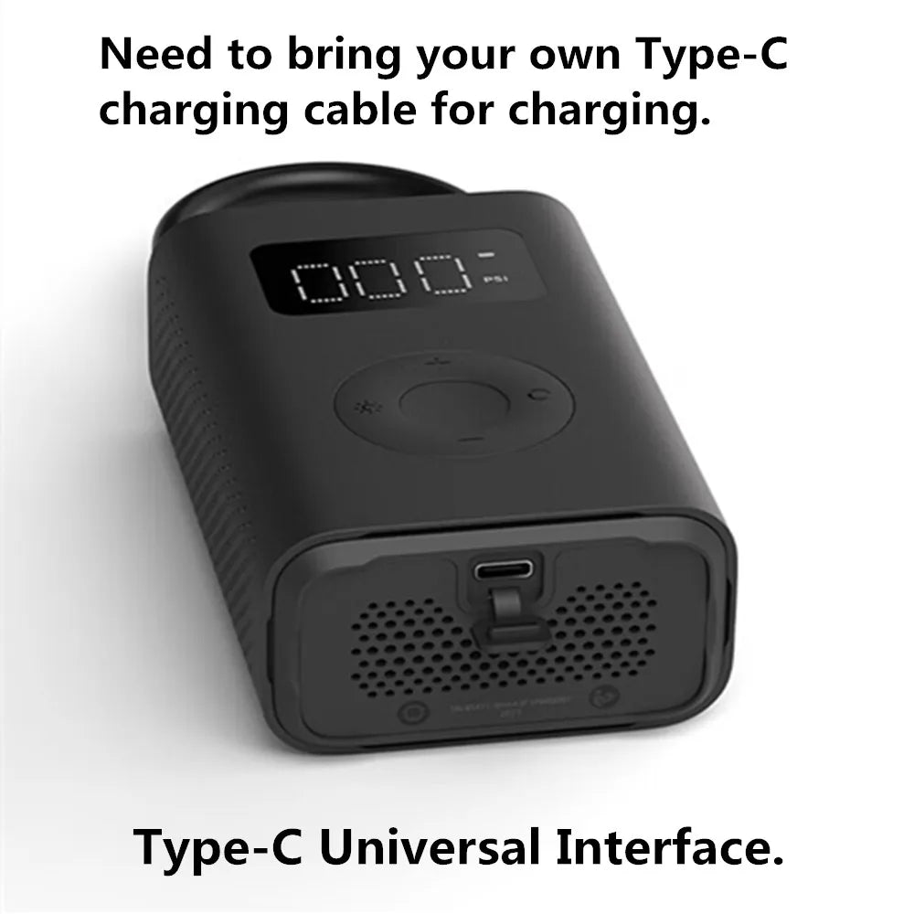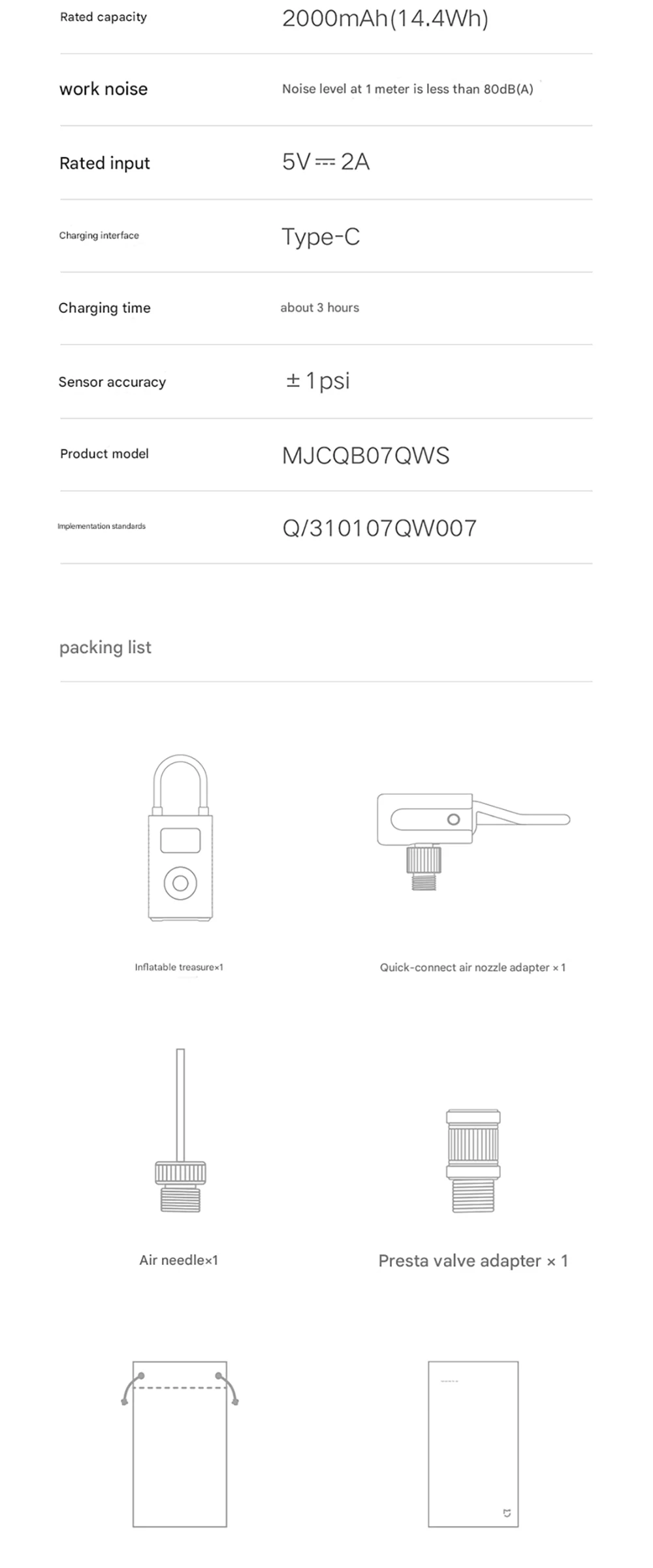 The product we link to sell is the Chinese version of the xiaomi air pump 2. The product’s logo is Mijia. The Chinese version of the xiaomi air pump does not come with a charging cable in its packaging accessories! Please bring your own Type-C interface charging cable for charging.