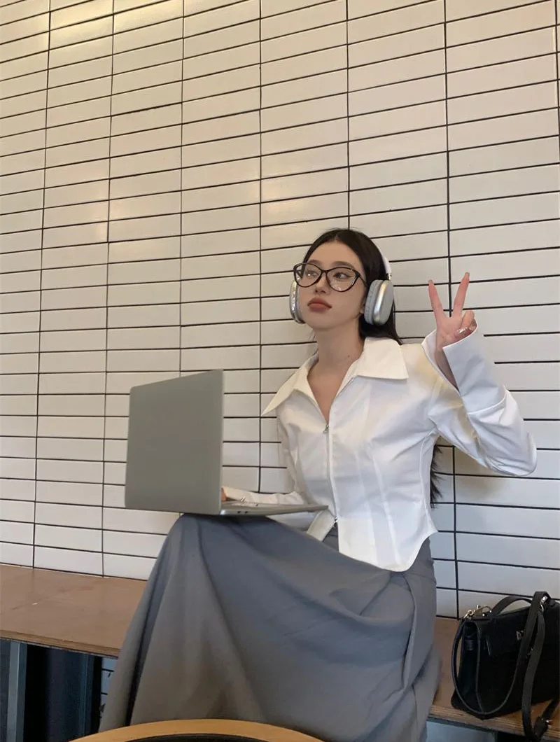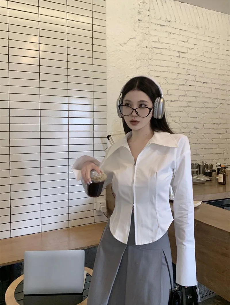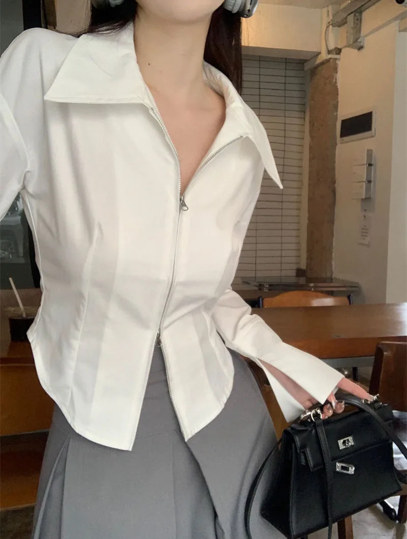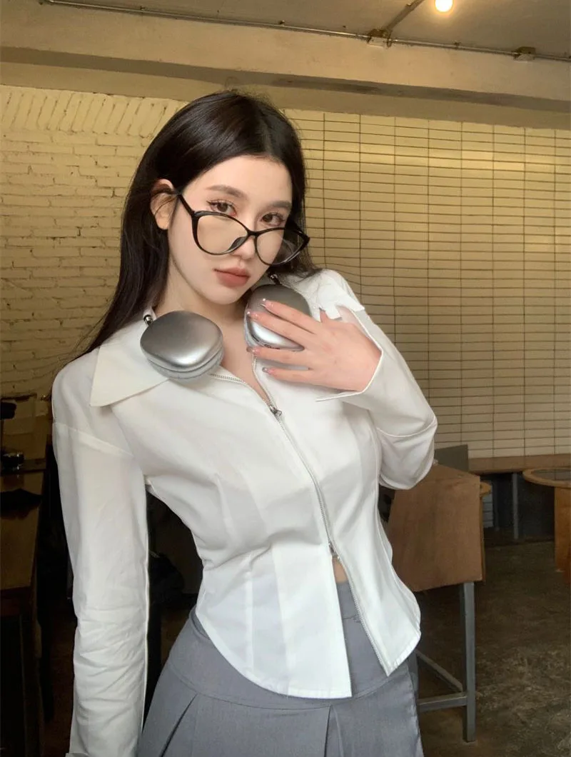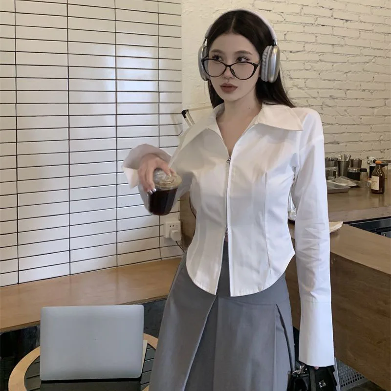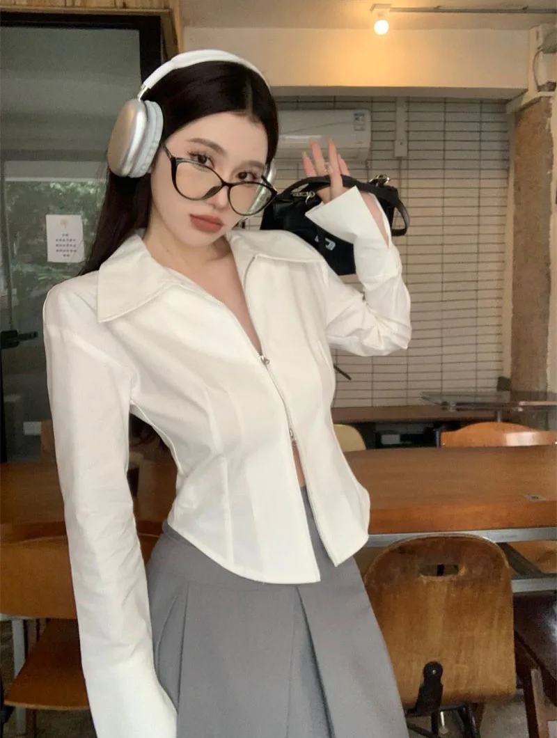 Xpqbb Y2K White Shirts Women Preppy Style Streetwear Tunic Long Sleeve Crop Tops Ladies Korean Fashion Slim Double Zipper Blouse