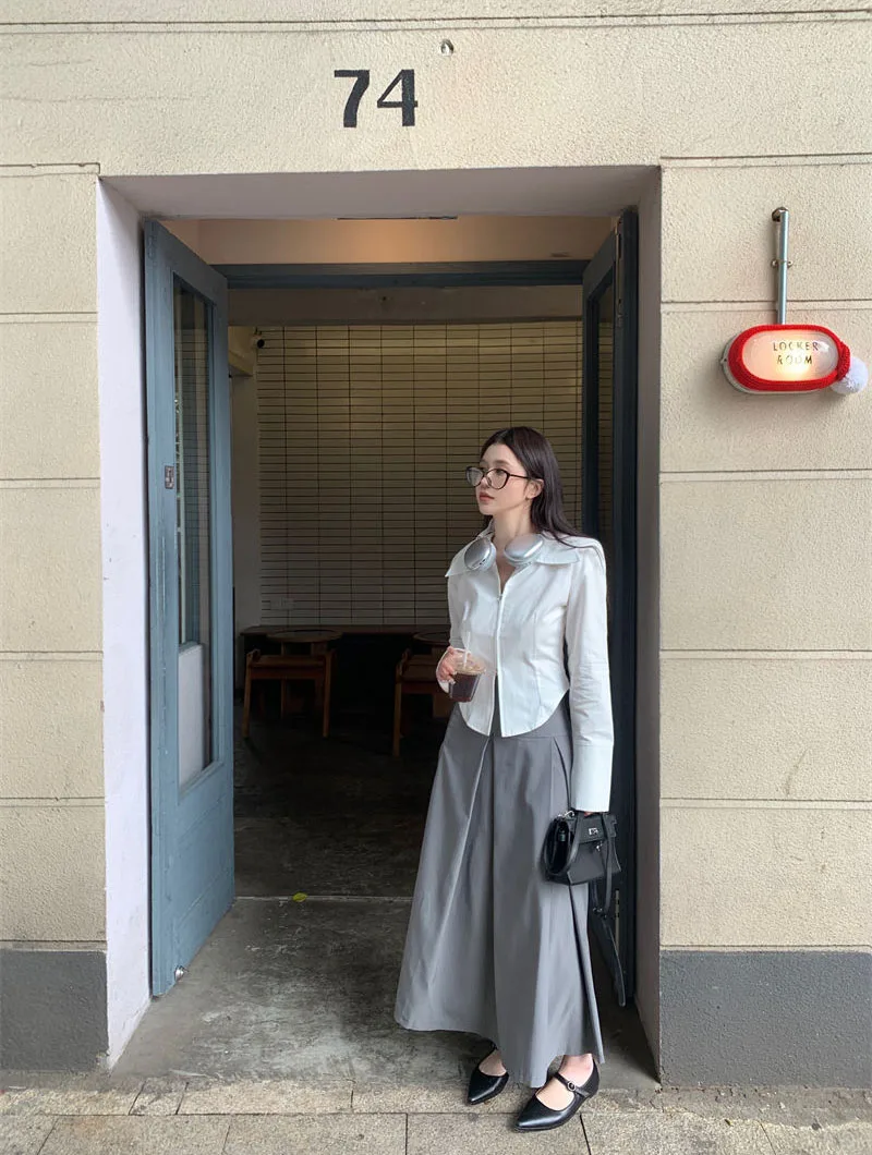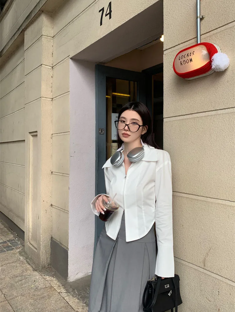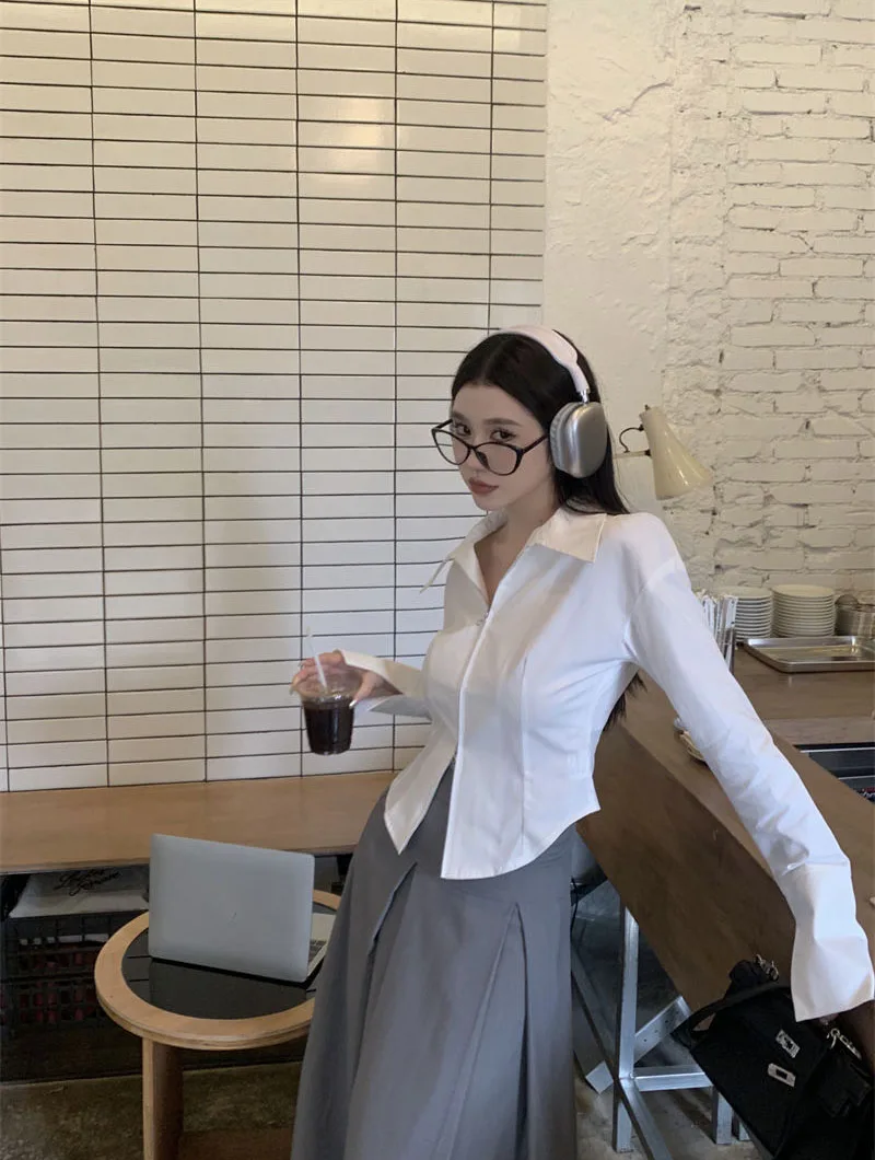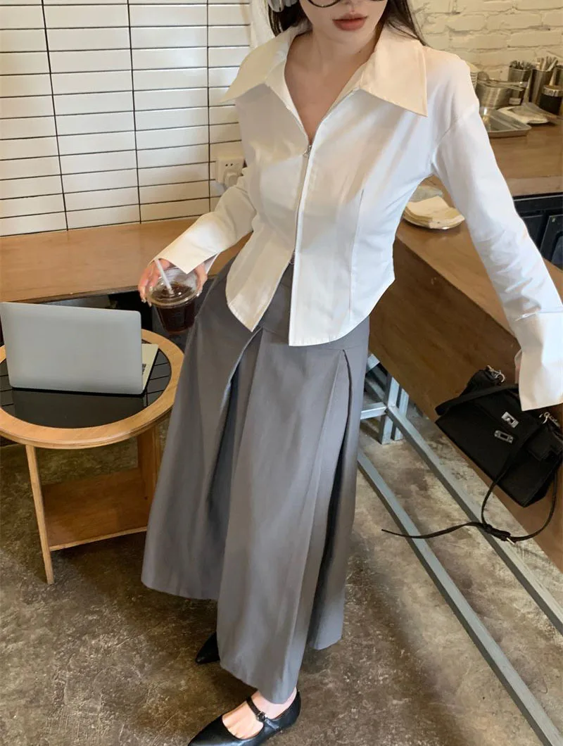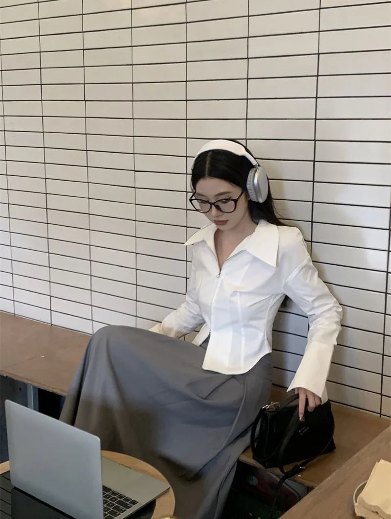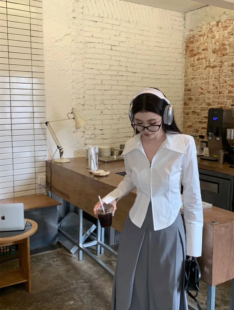 Xpqbb Y2K White Shirts Women Preppy Style Streetwear Tunic Long Sleeve Crop Tops Ladies Korean Fashion Slim Double Zipper Blouse